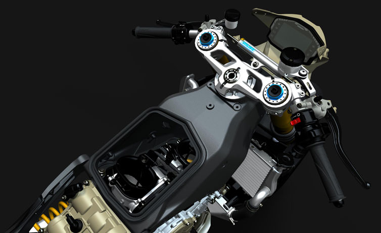 フレームレスに近い設計で、カーボン製エアクリーナボックスがフレームを兼ねており、その中にスロットルボディを組み込んでいます。車体の軽量化と共にフロント荷重を増す目的です。