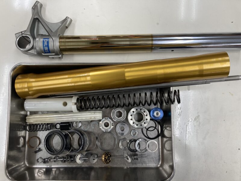 今回はインナーパイプ径φ48のOHLINSフロントフォークをMEダンピングチューニングと、スプリングレートを下げたMEスーパースポーツスプリングによってセットアップいたしました。