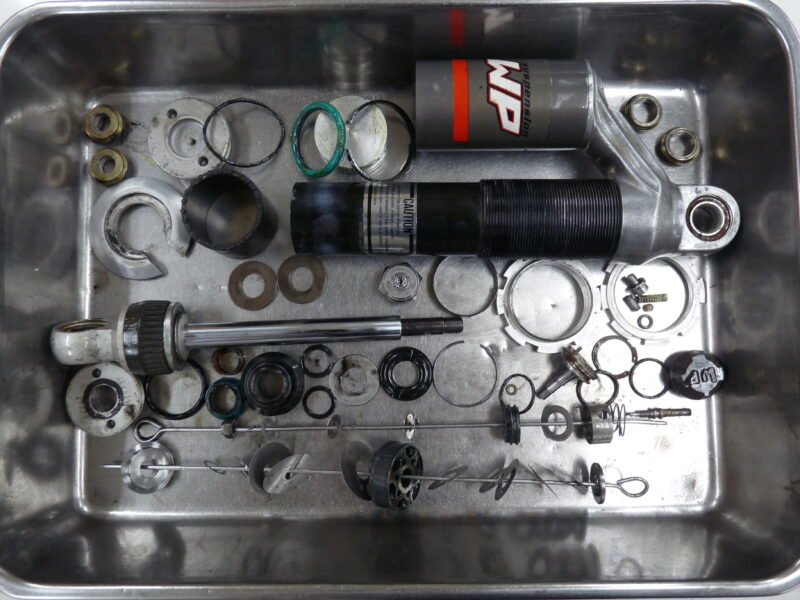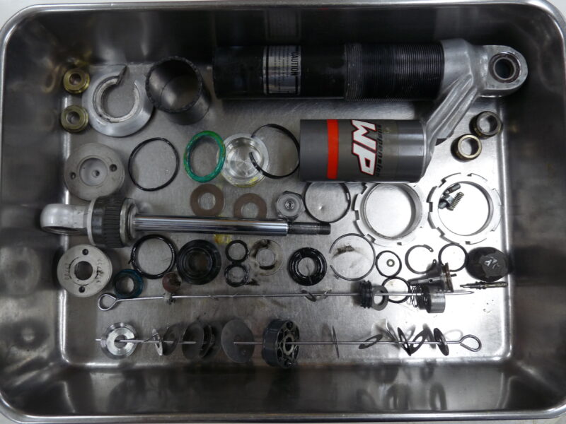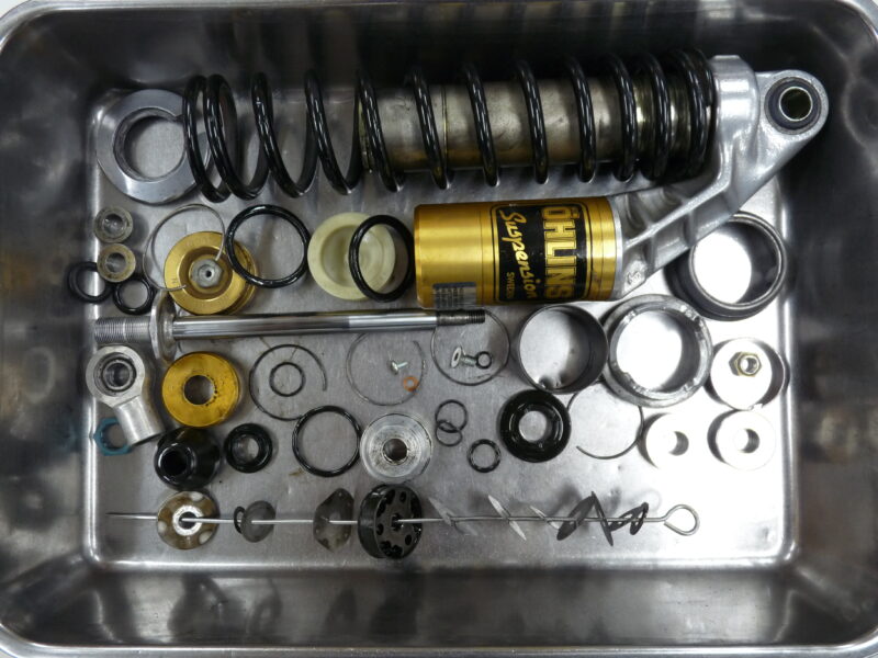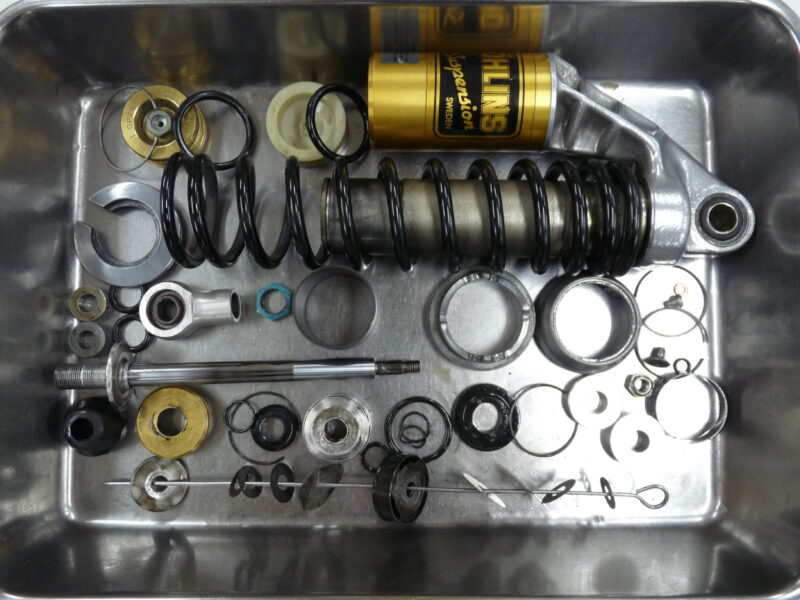 今回は、OHLINS製とWP(ホワイトパワー)製の2セットのリヤショックのフルメンテナンスをご依頼いただきました。