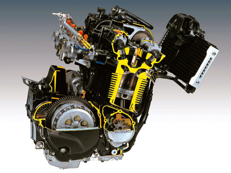 このモデルの最大の特徴は、1,401ccの油冷エンジンです。Bandit1200のエンジンをベースにエンジン幅を抑えるために、なるべくボアを広げずストロークを増やしたことで排気量をアップしています。そのために12.8kg-m/5,000rpmという強烈なトルクを得ることになりました。さらにクロス設定の5速ミッション+巡行用としてオーバードライブ設定の6速を加えて、ビッグネイキッドながら、ワインディングロードでのライディングを楽しめる工夫もされています。