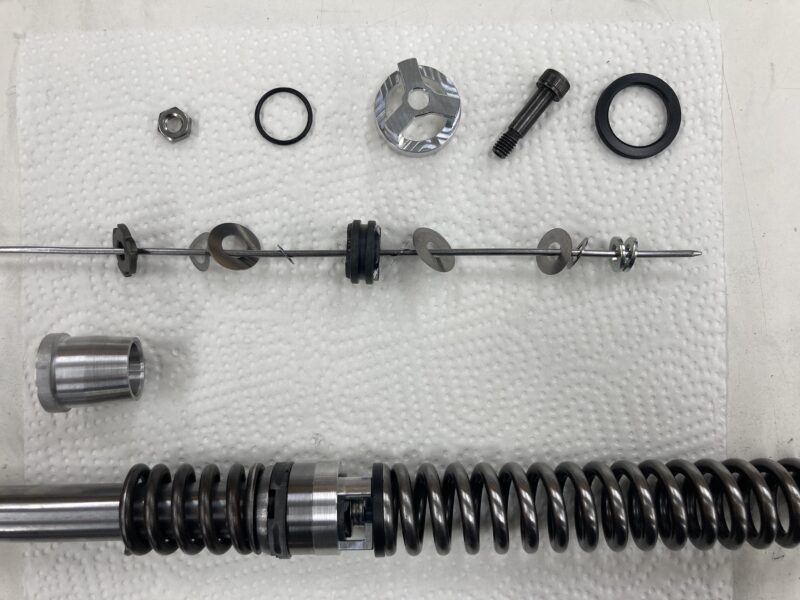 このモデルのフロントフォークに、スクーデリアオクムラオリジナルの「コントロールバルブ」を組み込んでMEダンピングチューニングによるセットアップが完了いたしました。