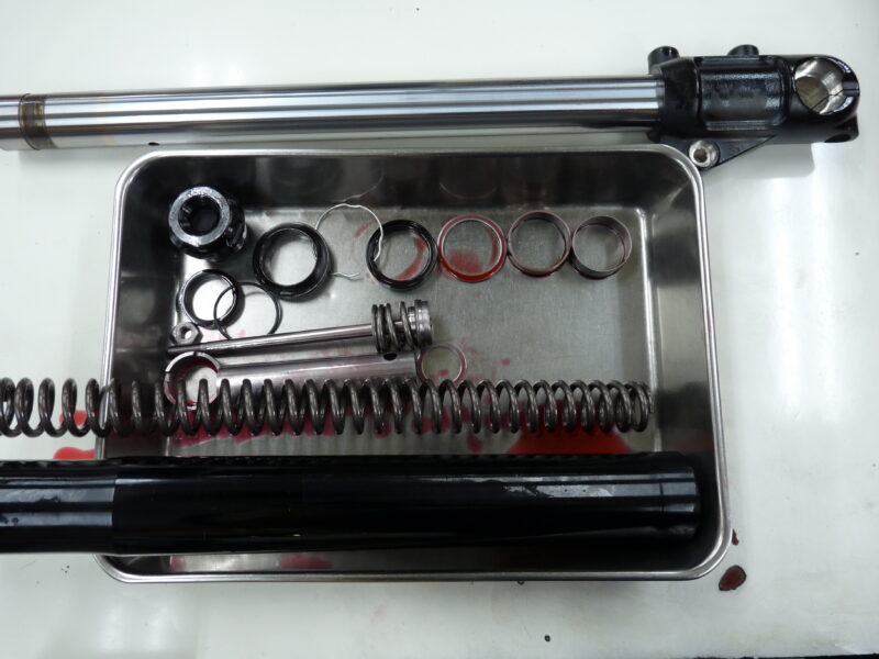 今回はSHOWA製倒立フロントフォークのフルメンテナンスに加えて、OHLINS製インナーカートリッジキットの組み込みをご依頼いただきました。このキットの組み込みには、R側インナーパイプボトムの脱着作業が必要となり、この作業も併せてお引き受けいたします。