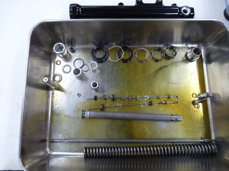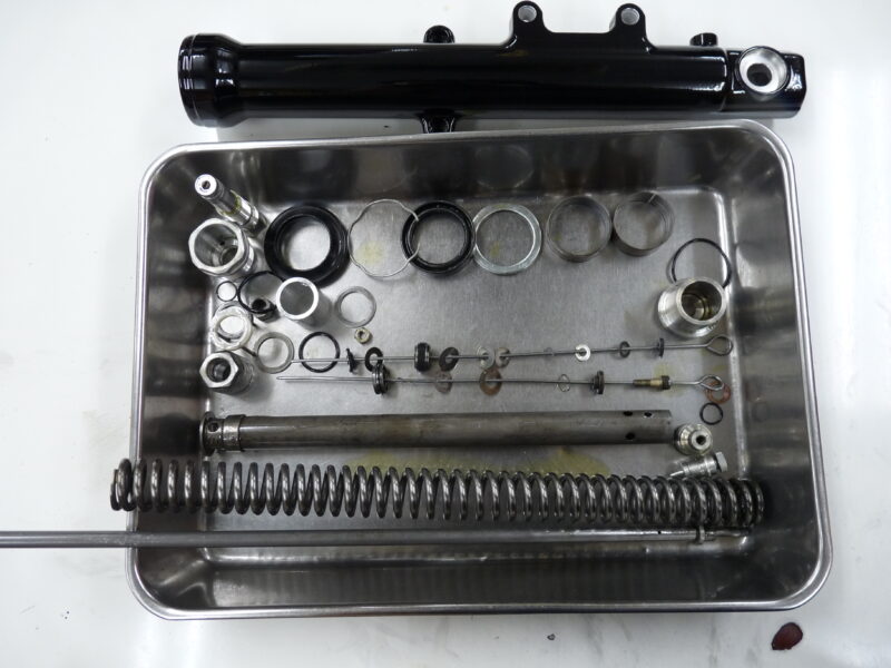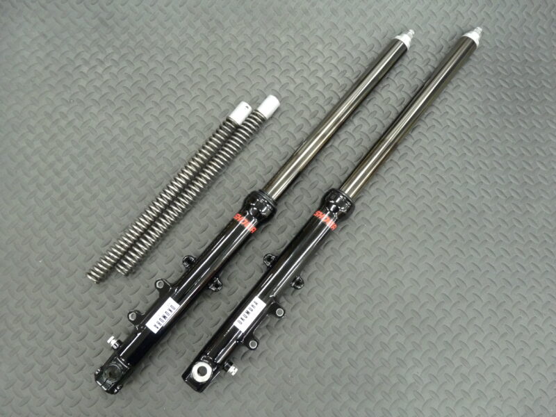 今回はフロントフォークのMEダンピングチューニング+0.80kgf/mのMEスーパースポーツスプリングでのセットアップに加え、インナーパイプへのME DLCコーティング(ブラック色)、アウターパイプのMEパウダーコーティング(ブラック色)によって、パフォーマンスとルックスの両面でのアップグレードのご依頼をいただきました。