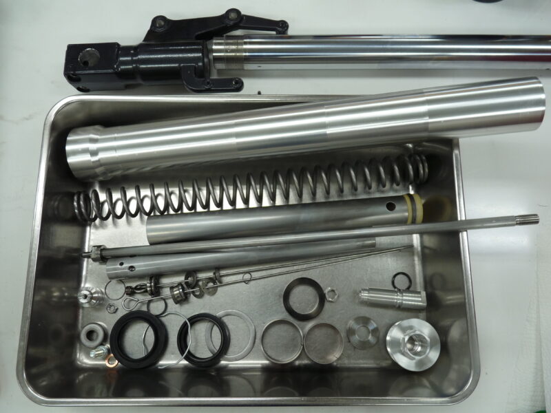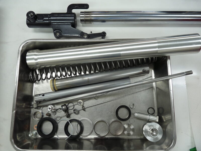 今回はフロントフォークのフルメンテナンスをご依頼いただきました。錆で傷んでいたインナーパイプを再メッキ加工によって再生して組み上げました。ノーマルのリヤショック、OHLINSなどリ・プレイスのリヤショックのフルメンテナンスもお任せ下さい。