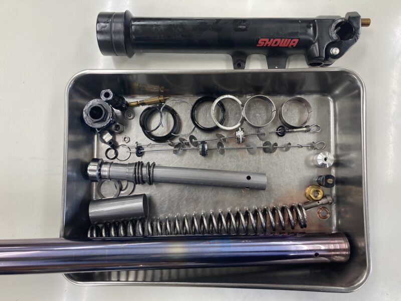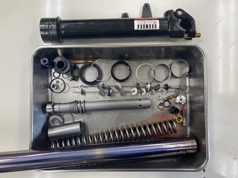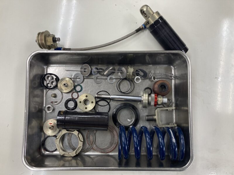 今回は、20年以上前にスクーデリアオクムラでフロントフォークのMEダンピングチューニングと、リヤにPENSKE RACING SHOCKSを採用していただいたお客さまより、前後サスペンションの定期的なフルメンテナンスをご依頼いただきました。貴重なマシンの足回りを私たちに委ねていただくことはたいへんありがたいこと。しっかりとメンテナンスを施してお納めいたします。