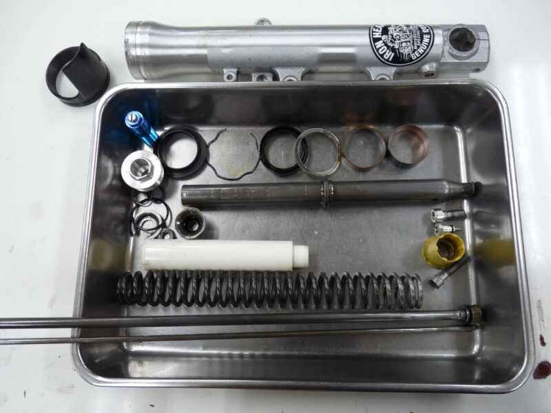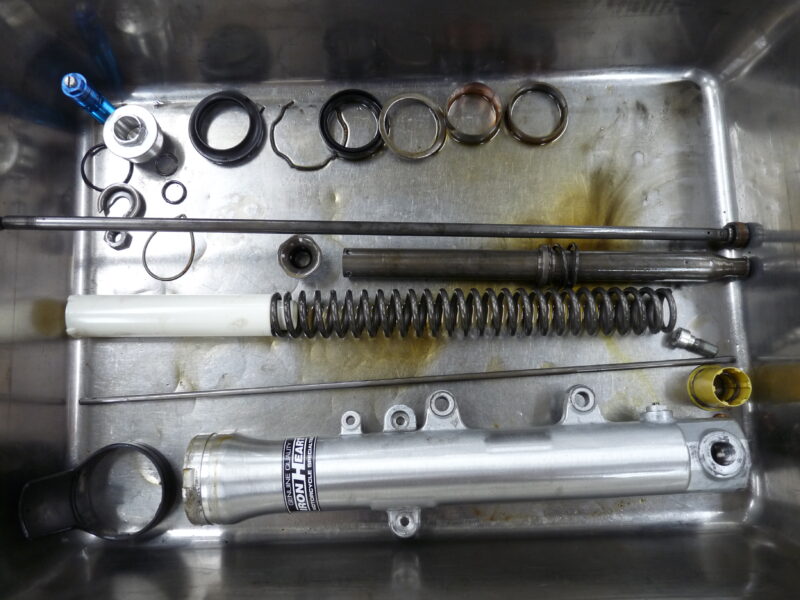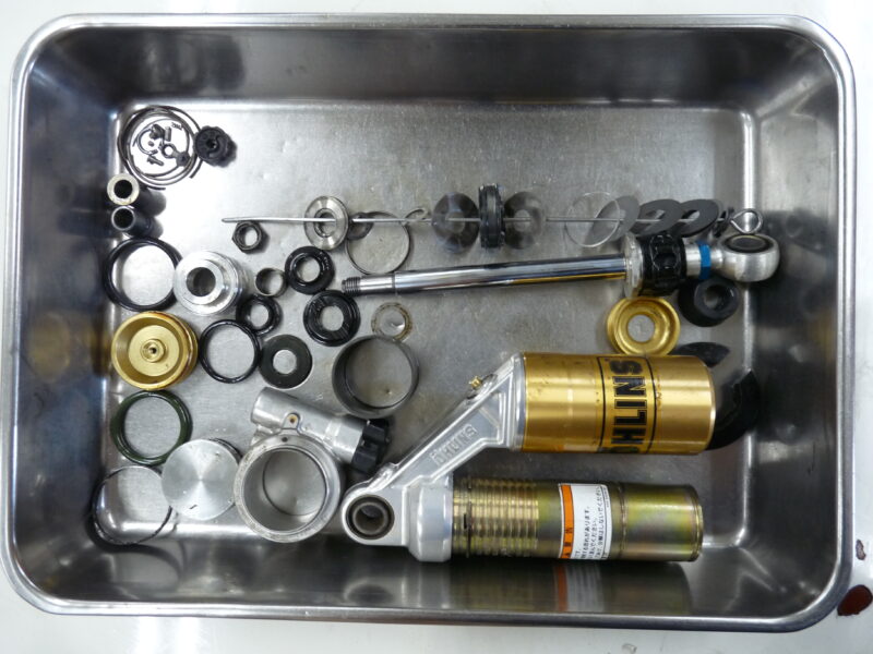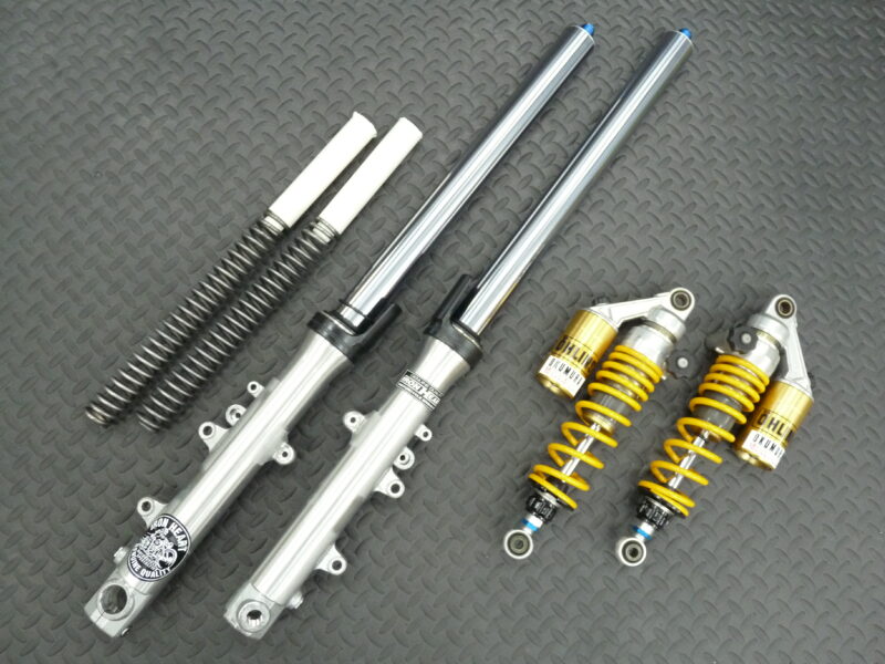 今回は前後サスペンションのMEダンピングチューニング(MEコンフォート)によるセットアップをご依頼いただきました。併せてフロントフォークスプリングは、0.90kgf/mのMEスーパースポーツスプリングを採用。錆で傷んでいたインナーパイプを再メッキ加工で再生。リヤショックのスプリングは、OHLINSイエローのMEパウダーコーティングで仕上げました。