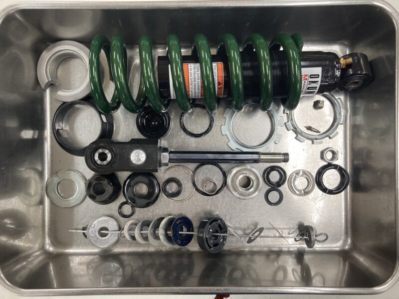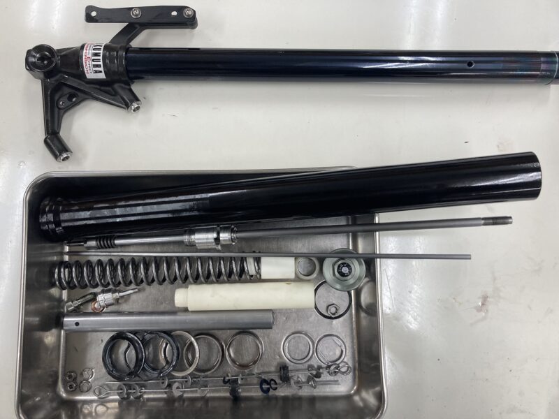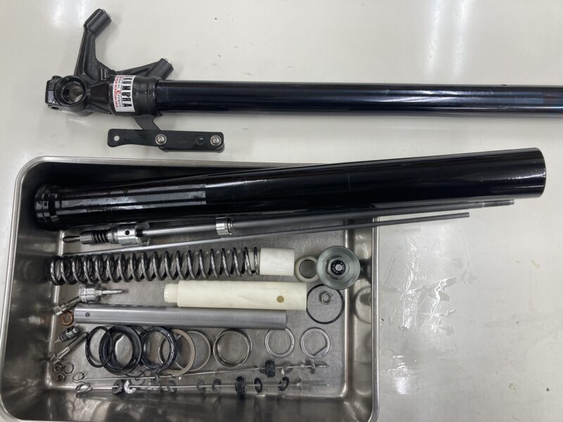 こちらのお客さまは、2年前に前後サスペンションのスプリングの変更を含むMEダンピングチューニングによるセットアップと共に、フロントフォークインナーパイプに加えてME DLCコーティング(ブラック色)によって仕上げています。今回、前後サスペンションのリフレッシュのためにフルメンテナンスのメニューをご依頼をいただきました。