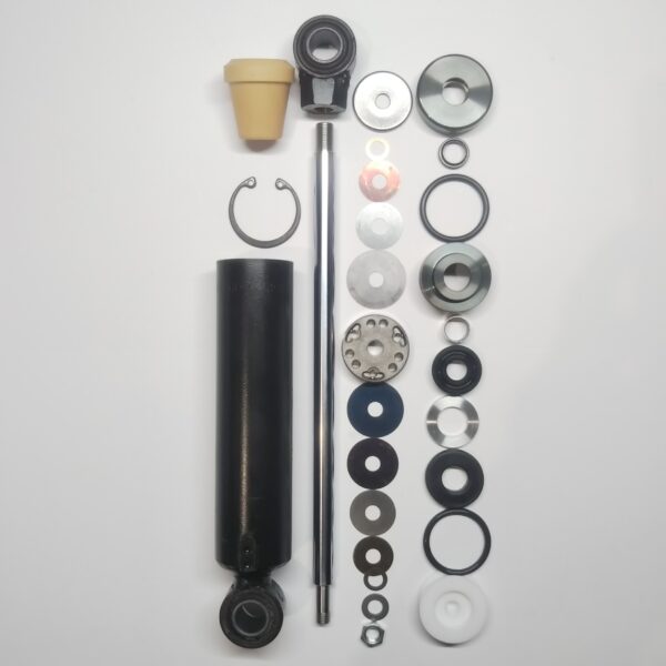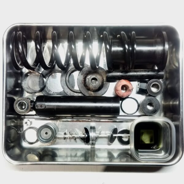 特殊なサイズのMarzocchi製フロントフォークと、BOGE製モノリヤショックですが、このリヤショックは非分解構造となっており、これまでお引き受けできませんでしたが、新しい技術を開発したことで、ダンパーロッドとシールホルダをワンオフ製作することによって、完璧なフルメンテナンスを施すことができるようになりました。