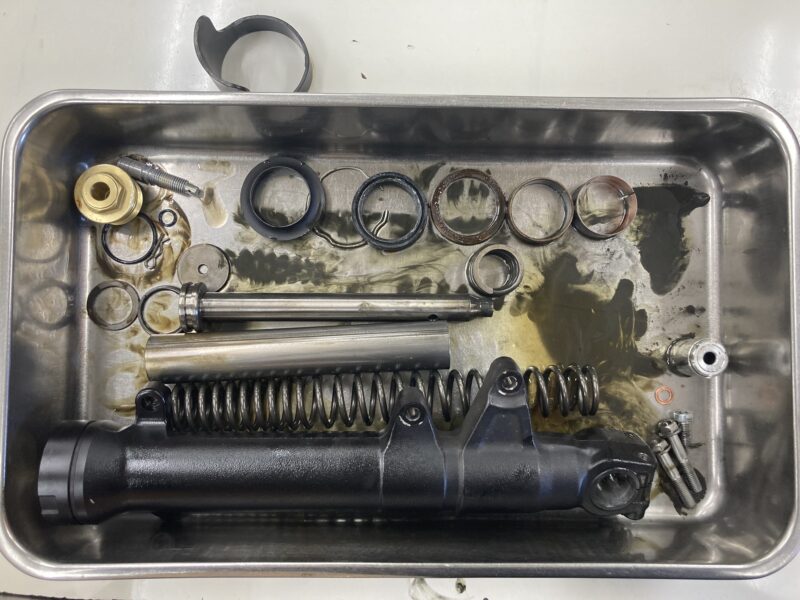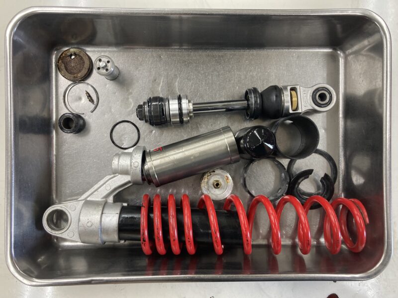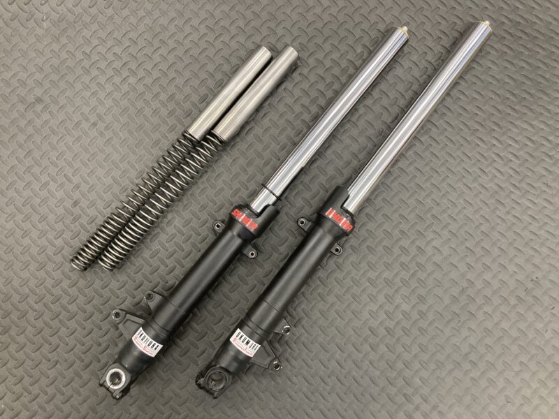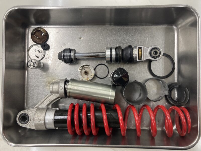 今回は前後サスペンションのMEダンピングチューニングをご依頼いただきました。フリーピストンタイプのフロントフォークには、スクーデリアオクムラオリジナルの「MEコントロールバルブ」を組み込み。リヤショックにはMEダンピングチューニングと共に、CB1300SFのショックボディを使って圧側ダンピングの調整可能なモディファイを施しました。