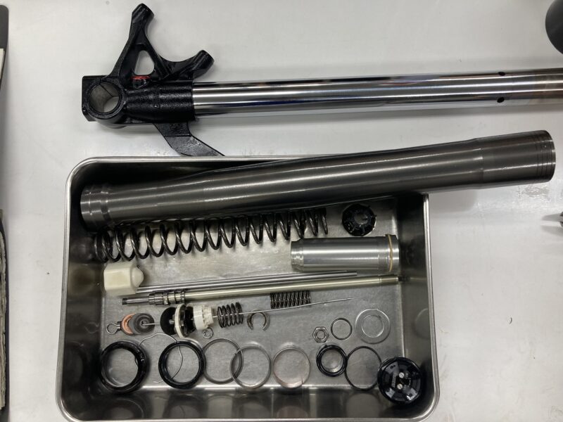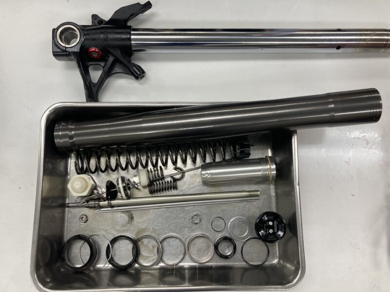 今回はSHOWA製フロントフォークのフルメンテナンスをご依頼いただきました。スクーデリアオクムラではリヤショックを含めて純正装着のサスペンションの、フルメンテナンス(フルオーバーホール)やMEダンピングチューニングによるセットアップをお受けしております。