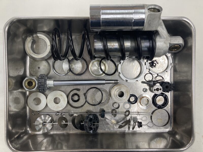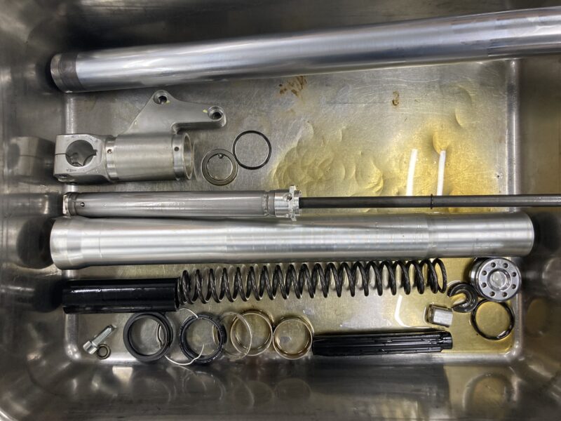 今回はMH900eに純正装着のMARZOCCHI製フロントフォークと、PAIOLI製リヤショックのフルメンテナンスをご依頼いただきました。